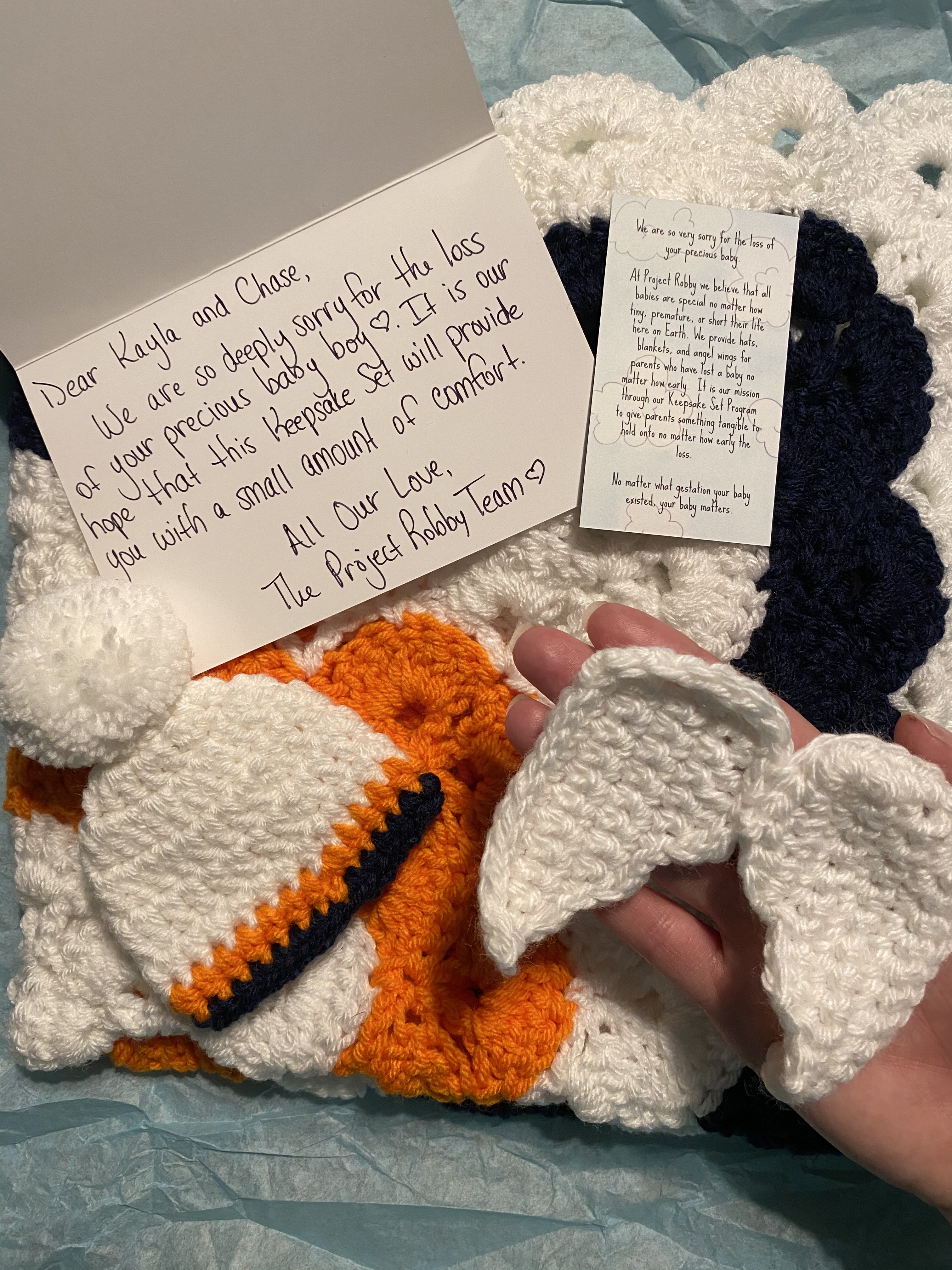 When Luca was born he was so fragile and so we weren’t able to change him into the little clothes we had brought. So when we got the Project Robby Keepsake it meant SO much to my husband and I. Now we have something his size to cherish forever. And to share with Luca’s little sister. The angel wings are my favorite reminder that we will see him again one day.